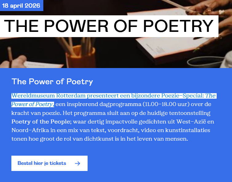Op 18 april organiseert het Wereldmuseum Rotterdam The Power of Poetry, een dagprogramma van 11.00 tot 18.00 uur over de kracht van poëzie. Het evenement sluit aan op de tentoonstelling Poetry of the People, waarin gedichten uit West-Azië en Noord-Afrika centraal staan.